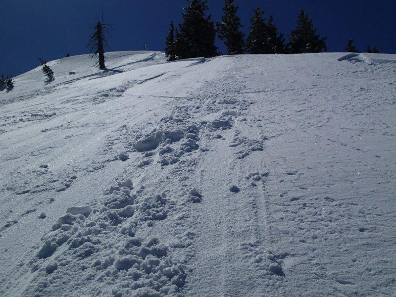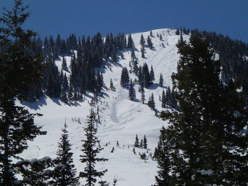 We picked a gorgeous day to go riding today up in the Providence Canyon area. Plenty of sunshine and some great snow up high. We made one run off of Millville Peak and were surprised by the quality of the snow. We found 3-4 new inches of snow from yesterdays storm sitting on top of a bit of a wind/sun crust (on certain aspects) from earlier in the week. In shadier aspects and off the ridge the crust disappeared and nice pow was plentiful. On the second run down the same zone (at about 9200 ft and on a northeast facing slope) I made a fairly hard heel edge carve just a few turns down off the ridge and kicked loose a small wind slab. Initially I thought it was just slough but as I glanced back I noticed it was a slab and it was picking up some steam. I pointed it and got off to the side to a safe zone and watched as it rolled down the middle of the line we were about to ride. The slab was shallow, probably only 4” deep but was probably 50’ wide at the widest section. It traveled around 600 vertical feet down the mountain and plowed through some trees and piled up nicely (maybe 4’ deep at it’s deepest). Probably wouldn’t have been enough to fully bury a person but would have made for a scary ride down.