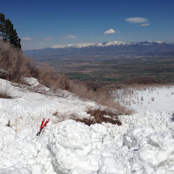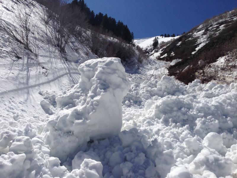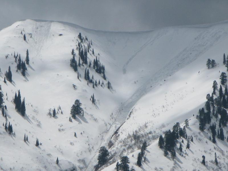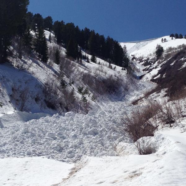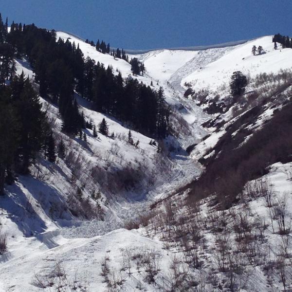 The avalanche was triggered by cornice fall and ran around 2000 vertical feet, filling North Hells Canyon with an impressive long, snaking pile of debris.