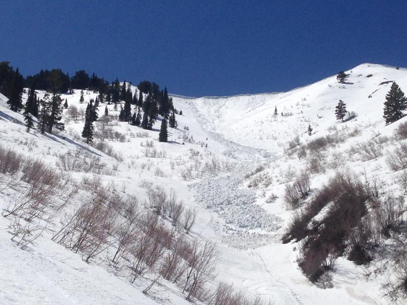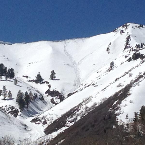 Several natural avalanches occurred near the end of last week's warm spell. These two sizable loose wet avalanches occurred sometime after 3:00 Friday 4-11-2014. Most likely later that afternoon.....