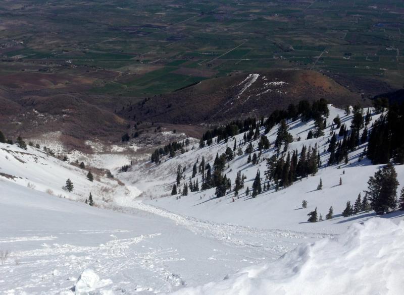 These are of a larger avalanche in Hell's Canyon. It was fairly active in the Wellsville Range late last week during the hot weather, but a few freezing nights and cooler days helped solidify the snow this week. Unfortunately, looks like another poor refreeze tonight and warm temperatures tomorrow though.