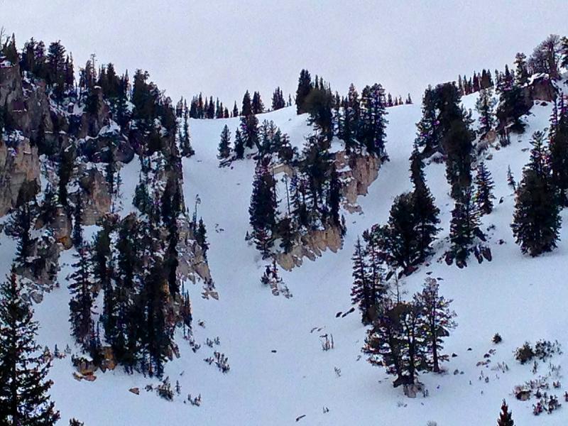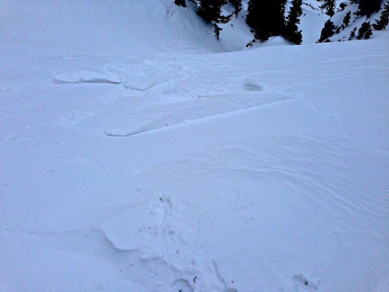 Intentional trigger,but surprised us a bit anyway. Pretty sensitive hard and fairly thin wind slab, failed with stomp on ridge-top. Avalanche was in the skiers right fork in the Y-Gully. Could've taken a person for a ride, with stiff chunks gaining speed quickly. Recently formed wind slab failed on sugary near surface facets.