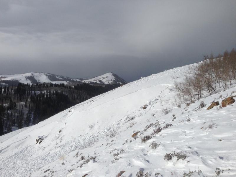 I came across this fresh wind slab avalanche today at mid-elevations on a drifted southeast facing slope. I encountered very strong west winds with substantial ongoing drifting at the exposed site.