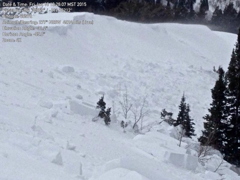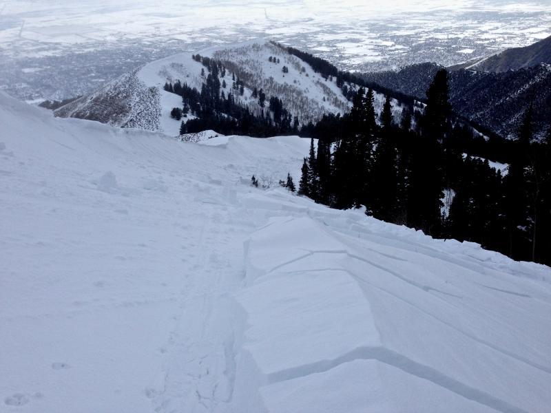 I was a bit surprised to run into this broad fresh wind slab, but it was on a heavily drifted slope... Southwest winds found plenty of soft snow to transport, and the south side of the ridge was scoured down to rocks. The hard slab avalanche was 1 to 3 feet and 400 to 500 feet wide and it stacked up a considerable pile of debris in the trees below. Most of the avalanche stopped after only running 50 vertical feet or so, but parts ran quite a ways further through the trees.