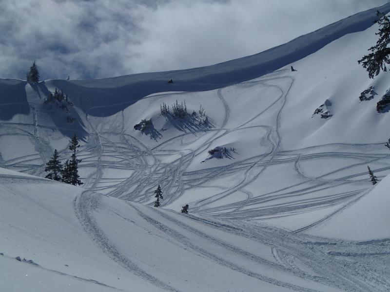 There were plenty of people out testing the slopes. We watched several sledders highmarking right under a huge cornice on the south end of Cornice Ridge (Half Dome). We were relieved that we did not have to use our avalanche rescue skills to recover buried snowmobilers.