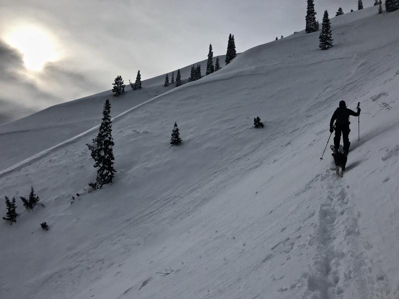 We visited the site on 12-18-19, made it up to the crown, and were able to size things up. The debris and bed surface were covered by a few inches of snow from late in the storm and has now become very weak and sugary. It was difficult to climb the steep avalanche path because it was like trying to move up through very loose sand, "sand boxing"