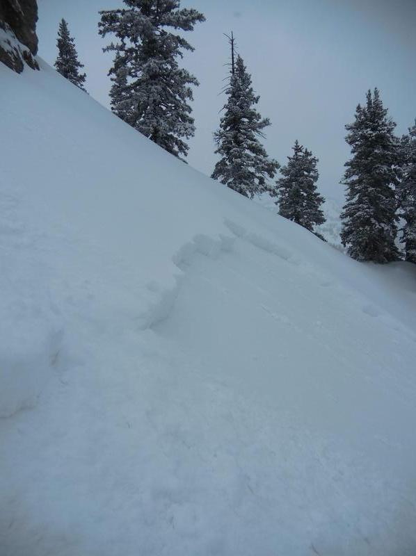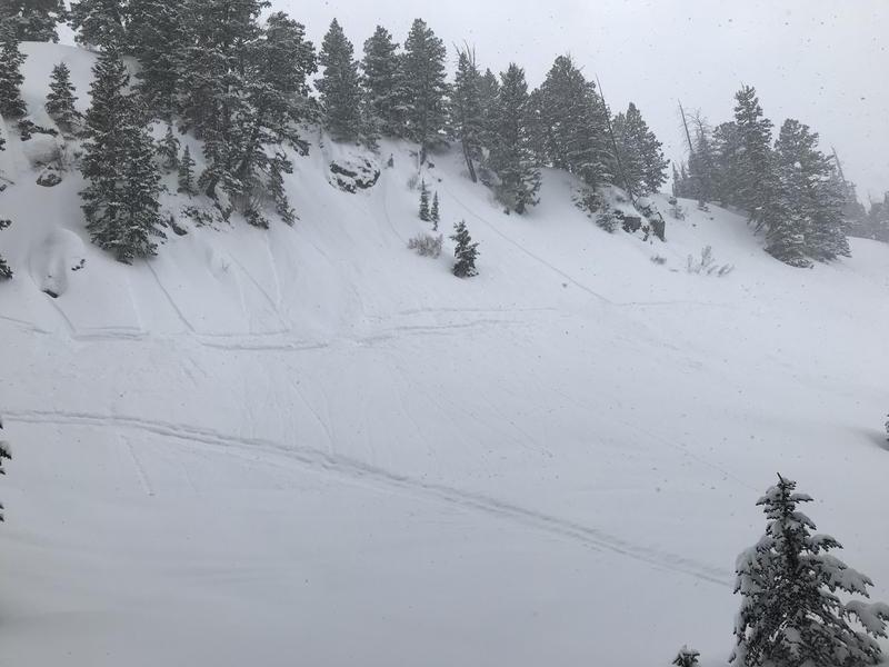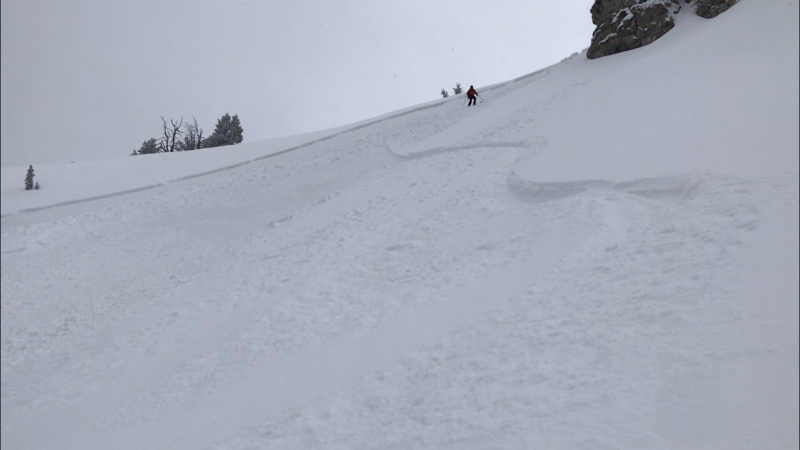 Avalanche occurred on the very hard (knife hard) surface and soft new snow interface. The avalanche occurred at a concaving 35 degree slope and ran very slowly and was easily cut out of to an island of safety. As we had planned I waited for my partner to ski down. Stay safe out there and always bring your beacon, shovel and probe.