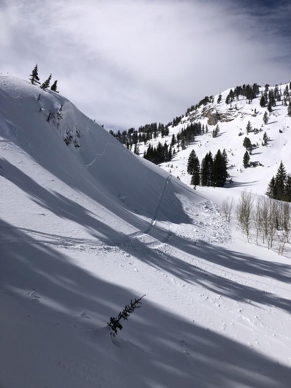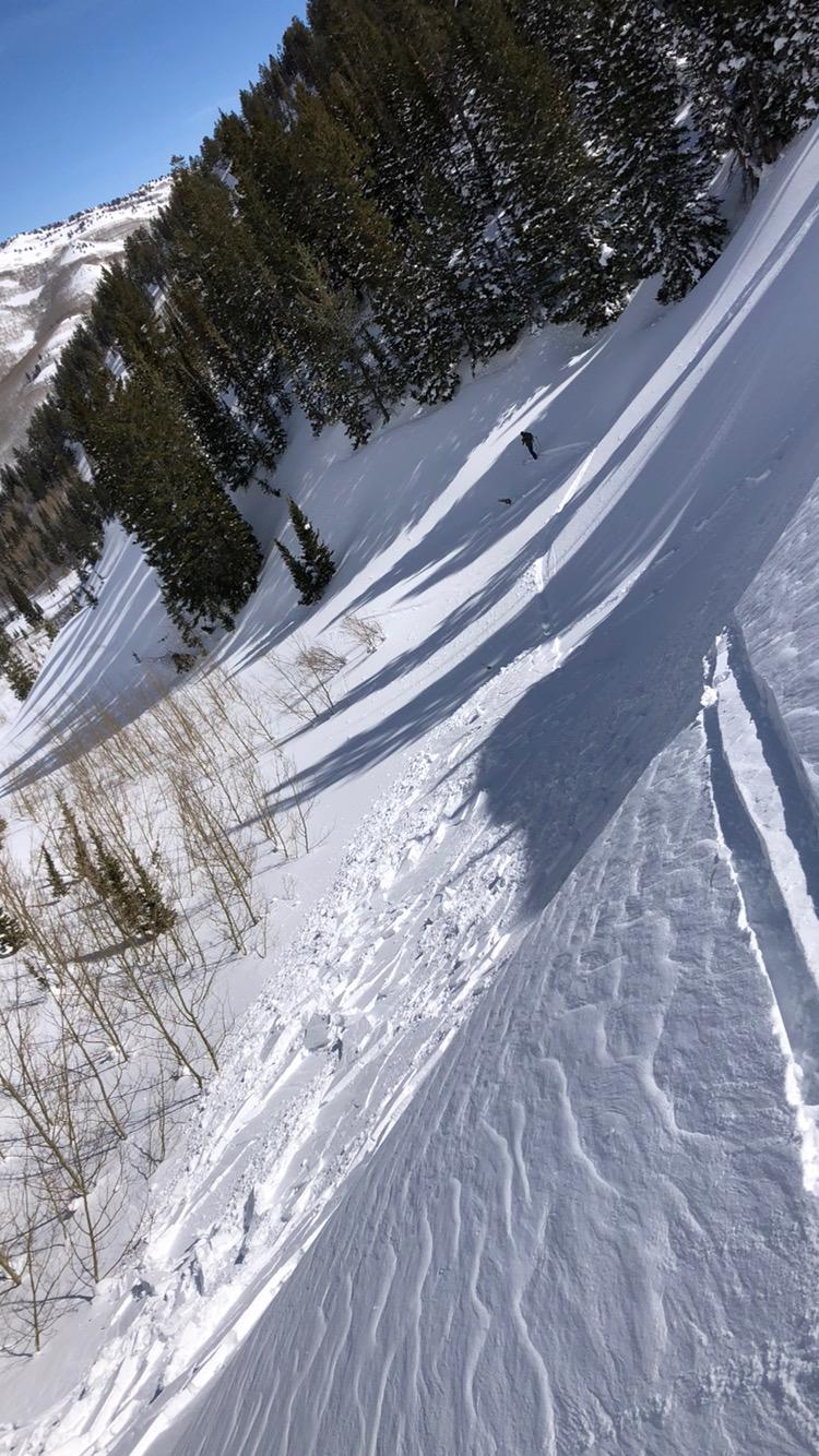 Exiting Flanagans area out silver fork the skier in front of me rode through a small bowl and caused a slide on a what appeared to be 30ish degree slope. It was only a few inches deep and didn't start sliding till he was out of it already.