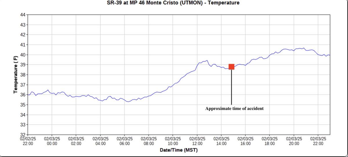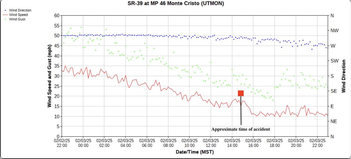 Monte Cristo Site SR-39 (8,966’) located four miles southwest of the accident site showing air temperatures, wind direction speed, and gusts from February 2, 2025, to February 3, 2025, with the accident time marked.