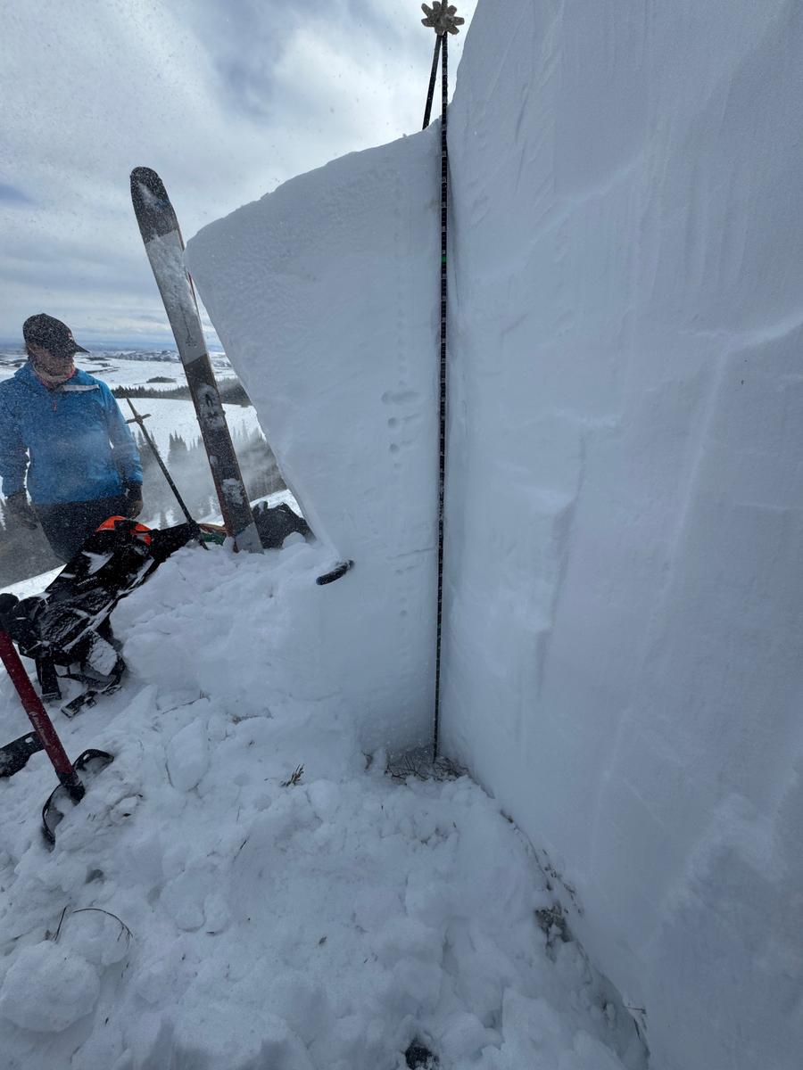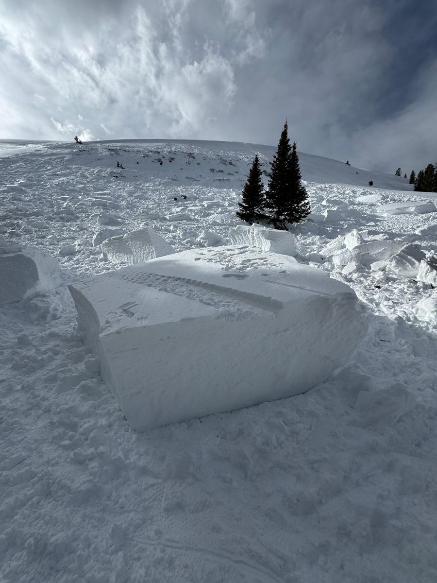 This slab of wind-drifted snow failed on a layer of buried near-surface facets and broken precipitation particles and also involved the more deeply buried facets that formed near the ground in December of 2024. This was a hard wind slab, with large chunks of debris remaining intact in the debris field.