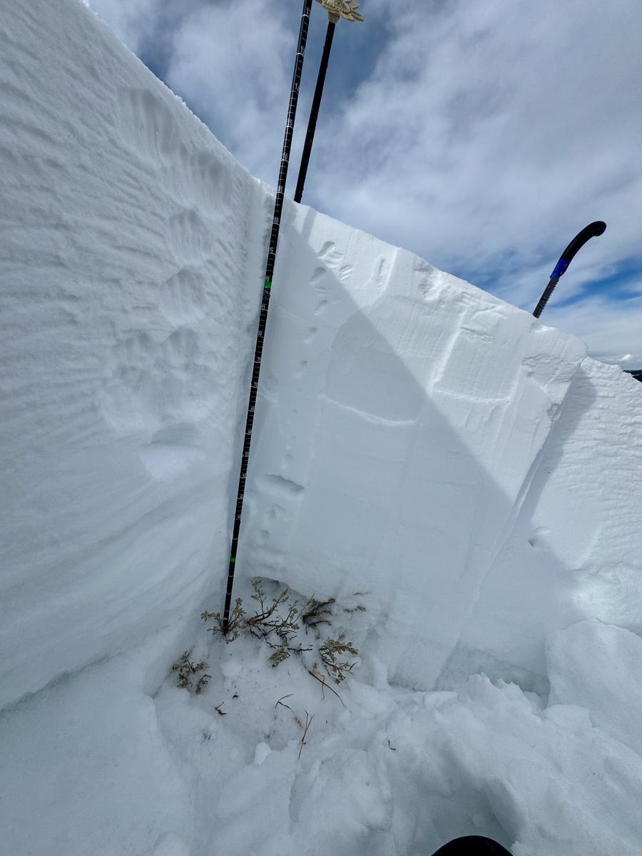 Snowpit below in the center lookers left of the crown in a much deeper and more wind affected location. This snowpit shows the variability of the bed surface and history of multiple wind events.