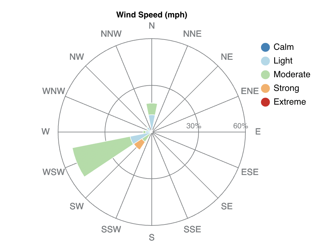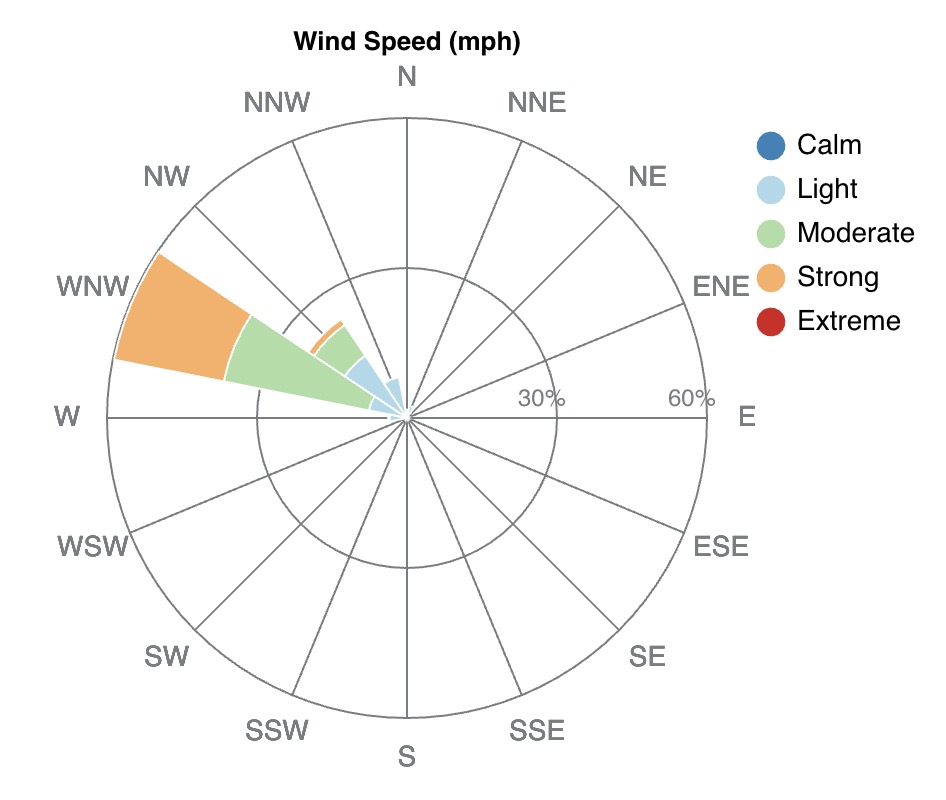 Wind rose and average speeds from James Peak (9425’), which is approximately 18.5 miles southwest of the site of this avalanche. The graphs show wind direction, distribution, and speeds from January 30, 2025 to February 03, 2025.