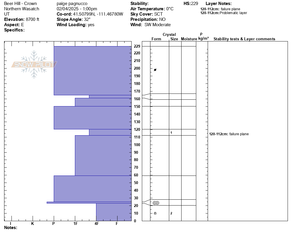 The avalanche danger for the Ogden Region on Monday, February 3, 2025, was CONSIDERABLE on this aspect and elevation. The bottom line for the day was that humans could likely trigger wind-drifted snow avalanches failing on one of two layers of buried facets.