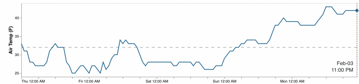 Temperature run and average air temperature from Monte Cristo (8931’) from January 30, 2025, to February 03, 2025. This shows us rising air temperatures at the tail end of the storm.