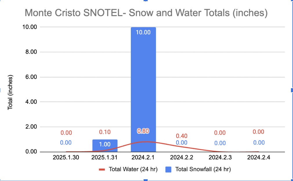 Snow and water totals for the storm cycle from January 30th-Febuary 3rd as measured at the Monte Cristo SNOTEL 8931’ (graph below).