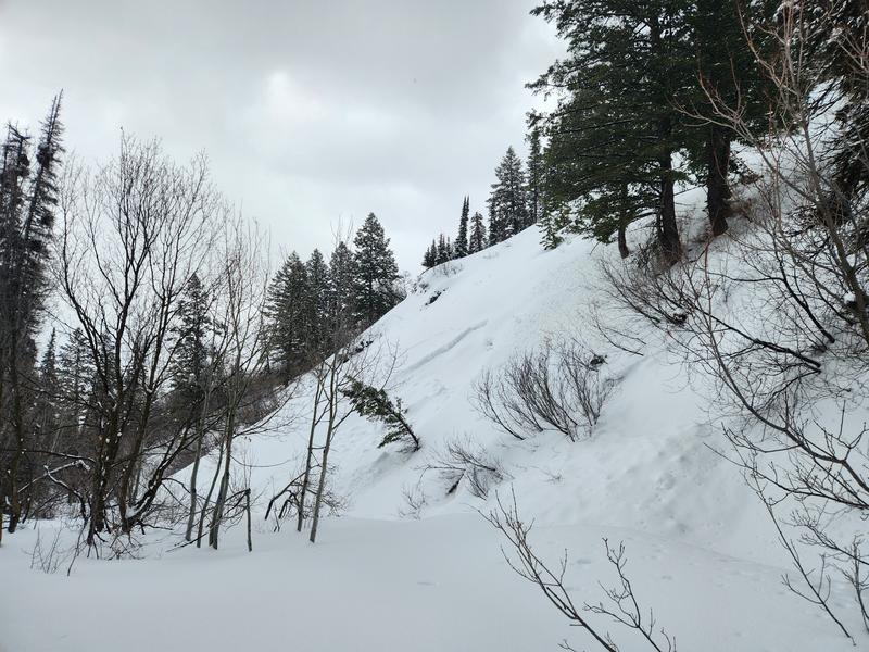 South side of the creek once on the summer hiking trail. Observed late afternoon. Quite a bit of cracking and whumping also observed along the uptrack but did not see any other slides in the lower Cutler environs.