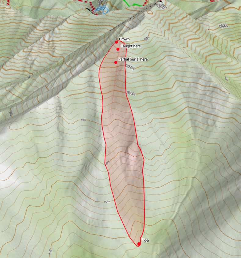 In hindsight, we got out onto what appeared to be a wind loaded slab, that initially fractured about a foot, then stepped down and propigated, probably to the persistent weak layer. Looking at the size of the slide, we are lucky to be alive. Mistakes were made, and I know I will surely learn from them, hopefully people reading this will too.