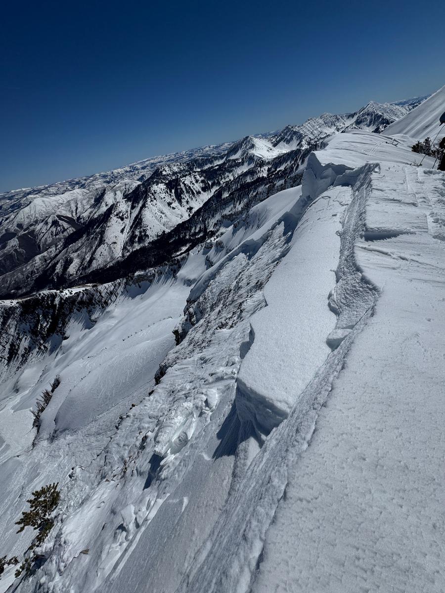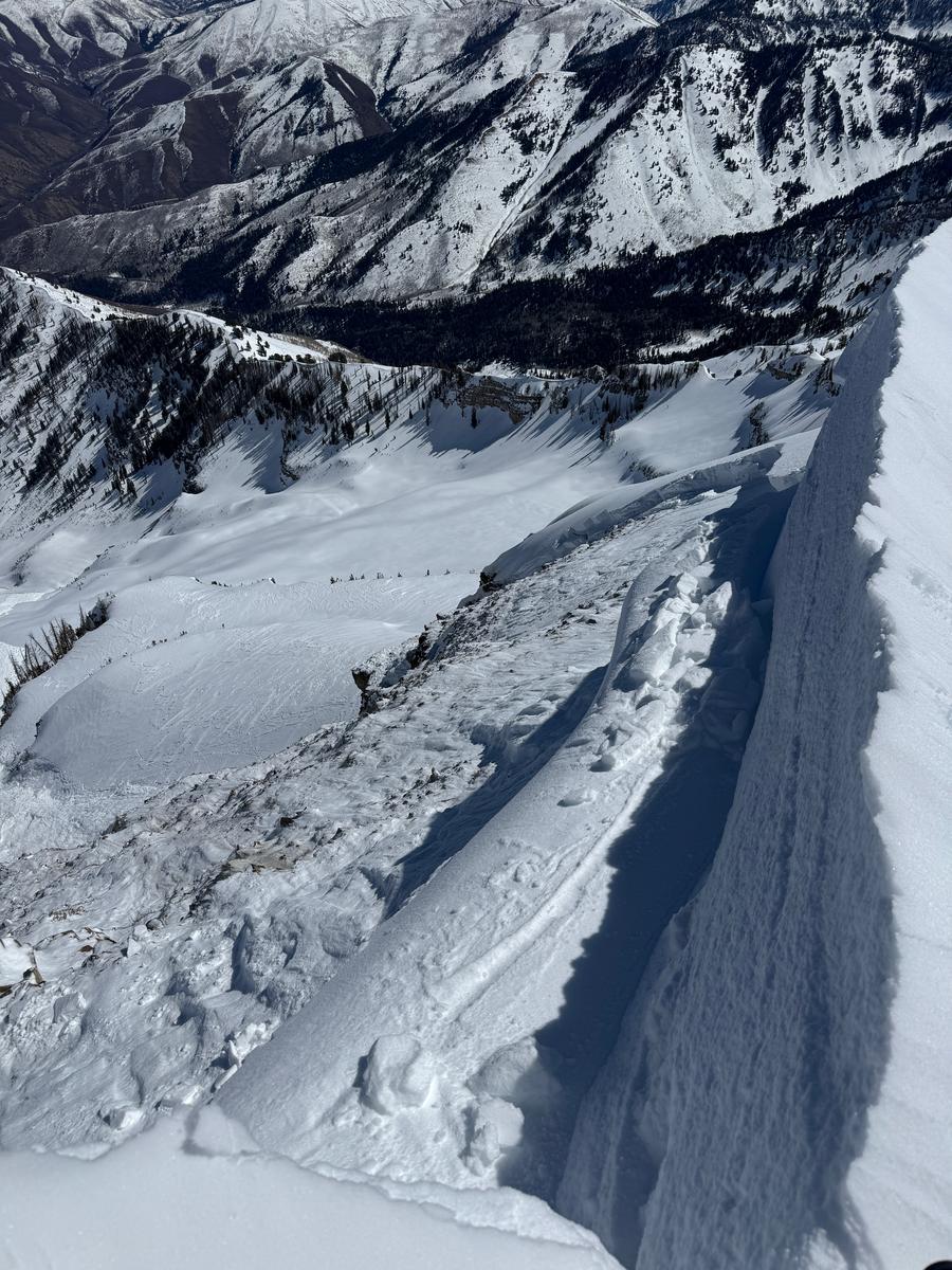 We had discussed cornice hazard as one of our problems for today, and had mentioned staying back from the ridge to be safe. While we were transitioning from skins to skiing, this avalanche was triggered by one of our party members putting the tail of their ski into the slope on the backside of the cornice. This is what triggered a massive collapse and the subsequent avalanche. Best guess on dimensions, 3'-4' deep x 200' wide running between 2,300' and 2,400' vertical feet.