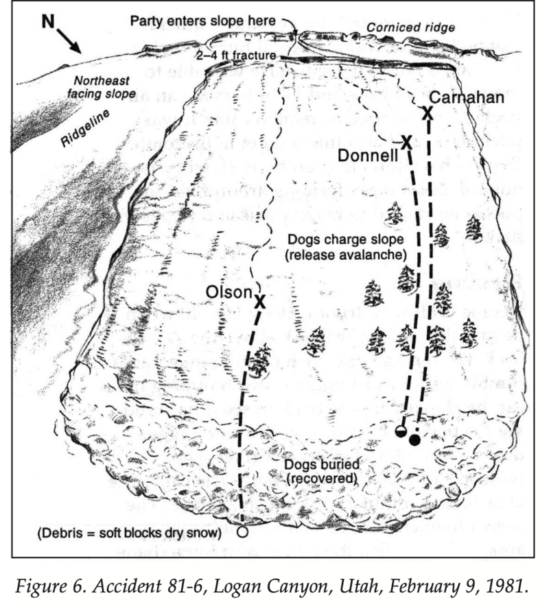 Monday the 9th was the second day of a planned four-day trip for Bruce Olson, age 28, David Carnahan, 26, and John Donnelly, 22, and their three dogs. They left Logan Canyon the day before and had skied to the head of Bunch Grass Canyon. On Monday, they descended onto a lee slope beneath a cornice, planning to do some skiing in the new snow. The time was noon and it was snowing moderately with strong winds loading the slope with blowing snow. All three men were standing still when the three dogs charged onto the slope. At that moment, the slope released 8–10 feet below the cornice.