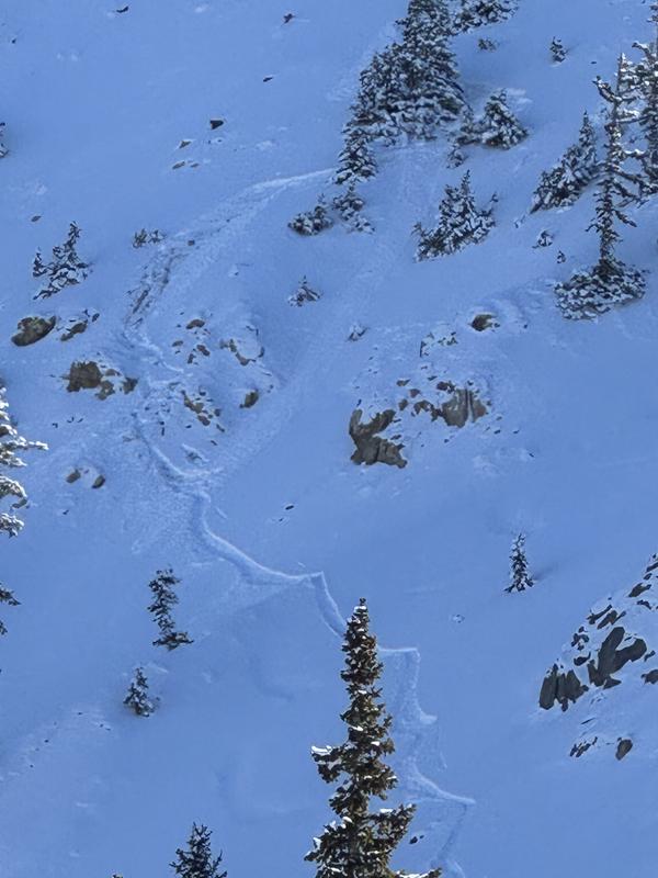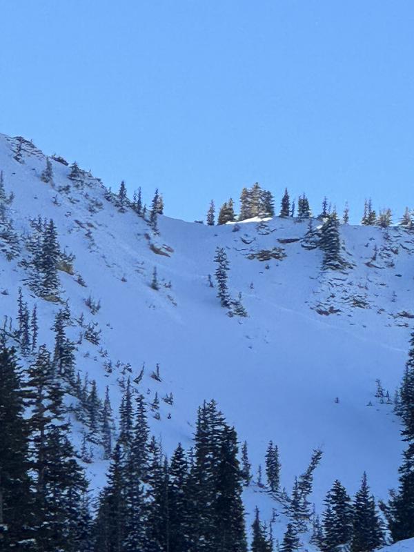This was the second avalanche we noticed while out touring in Sunset Peak area. Base up there is around 40 cm on prob so about 15 inches. Dug a pit and collapse within first 5 taps not very strong base with multiple concerning layers. Very dry weak snow with a with two more compacted icier layers in between the loose dry layers.