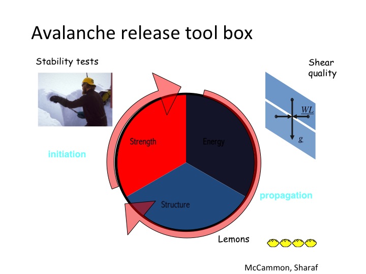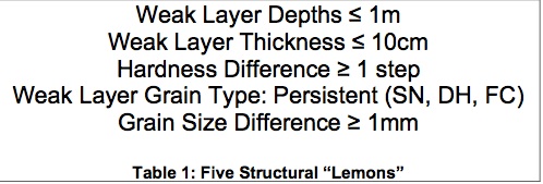 - Stability Wheel With no bull's eye clues to go on (recent avalanches, cracking, collapsing, avalanche weather, etc - or see below regarding other clues from Mother Nature), we took a close look at the Stability Wheel (as developed by McCammon, Sharaf, Schweizer, and others). It looks to balance Strength, Energy, and Structure in a way that gives meaningful data for your Go/No Go decision making. Below isTable 1 - the 5 structural Lemons (or Red Flags) one may find in a snow pit. In other words, the more lemons, the worse structure you have. But - some lemons are more sour than others - which can be understood through experience or education.