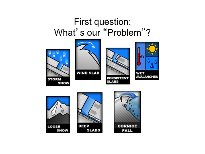 - Take a microscope to the 7 Avalanche Problems (Storm Snow, Wind Slab, Persistent Slab, Loose Snow, Deep Slab, Wet Snow, Cornice) with the goal of better understanding why, how, and where they form...and whether each is "manageable", or "unmanageable". Photos of each painted a clear distinction of each Problem. We looked at how each problem is rated based upon Likelihood of triggering, Expected Size of the avalanche, Location in regards to aspect/elevation, and then Trend.