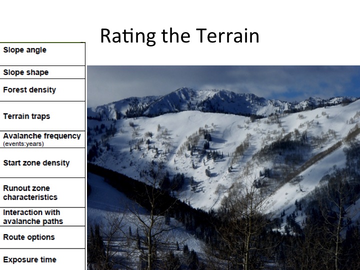 You have many great points about overall risk and hazard for the backcountry, but they combine avalanche conditions, human psychology as well as terrain. My initial foray into this is categorizing routes (and by extension terrain) which is static; in other words, it never changes whether the danger is LOW or Extreme. That's why you and I will go to USA bowl or the Willows or Powder Park or Silver Fork when the danger is elevated and not Gobbler's or Superior.