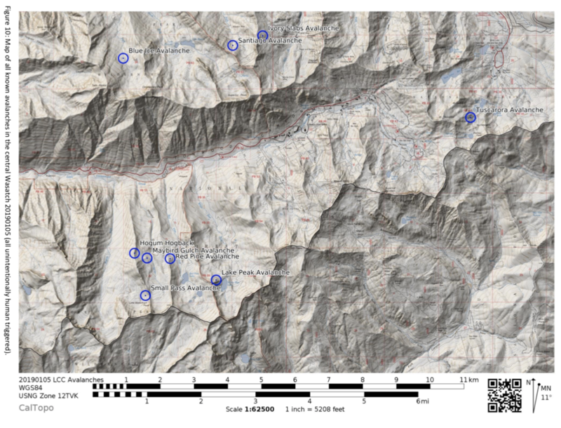 Figure 10: Map of all known avalanches in the central Wasatch 20190105 (all unintentionally human triggered).