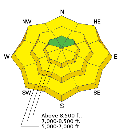 There is a 40% chance of continuing snow showers this morning, with little in the way of accumulation. It will be partly sunny today, with high temperatures at 8500' expected to be around 36ºF, with 14 to 17 mph west winds. It will be mostly cloudy tonight, with low temperatures around 27ºF, and 16 to 22 mph west-southwest winds. Snow showers are likely tomorrow, with 2 to 4 inches possible. High temperatures of around 36ºF are expected, with southwest wind 22 to 25 mph, gusting into the 40s.