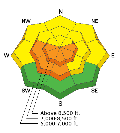 It will be sunny today in the mountains again, with high temperatures at 9000' expected to be around 52ºF and 6 to 9 mph west-southwest wind. It will be mostly clear tonight with low temperatures around 34ºF, and 14 mph southwest winds. There is a 40% chance of rain and snow showers tomorrow afternoon, but little accumulation is expected. It will be partly sunny and warm, with high temperatures around 53ºF and 13 to 16 mph southwest wind.