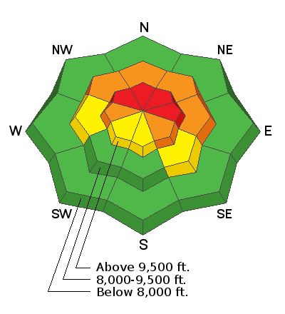 Travel is not recommended on or adjacent to slopes steeper than 30 degrees at the mid and upper elevations on aspects facing northwest through east.