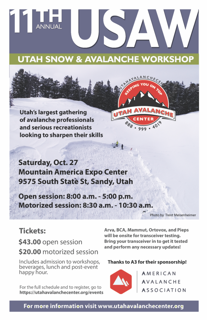 Next up is our 11th Annual Utah Snow and Avalanche Workshop (USAW) on Saturday October 27th at the Mountain America Expo Center in Sandy. Yep... the same day and location as the Intermountain Snowmobile Show