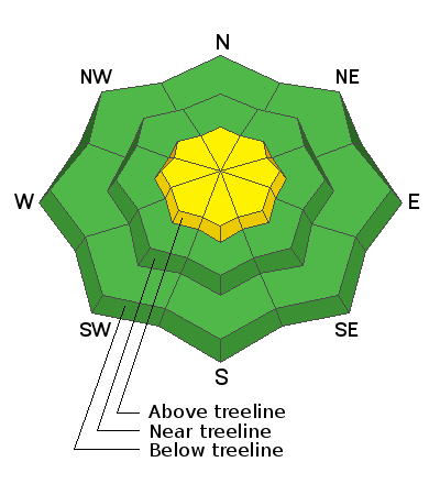 Lose a little elevation to wind sheltered slopes or swing around to terrain with no old snow near the ground and you'll find LOW avalanche danger.