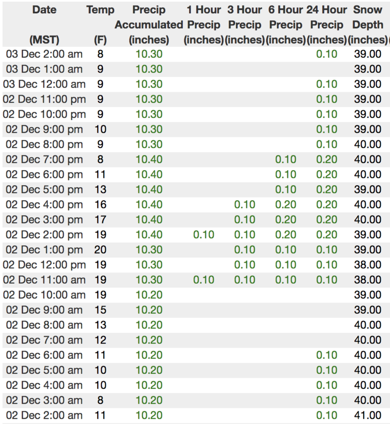 We are working to get the entire Uinta weather network back online. In the meantime, above is 24 hour data from Trail Lake (9945').
