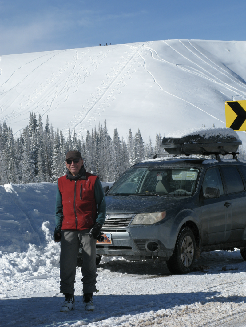 Jeff Duenwald surveys his weekend turns on a south facing slope (lookers left portion of the image) with no old snow near the ground. Looks pretty straight-forward, but here's the problem... as snow stacks up and terrain turns white, even slopes we're familiar with can appear uniform and small nuances in aspect can mean the difference between riding safely and triggering an avalanche. A true, big mountain BA, Jeff is in his mid 70's and is on the snow nearly everyday. He's been tagging big mountain approaches and ascents since the 60's. His longevity in the mountains is rooted in making smart decisions, not by rolling the dice or taking chances