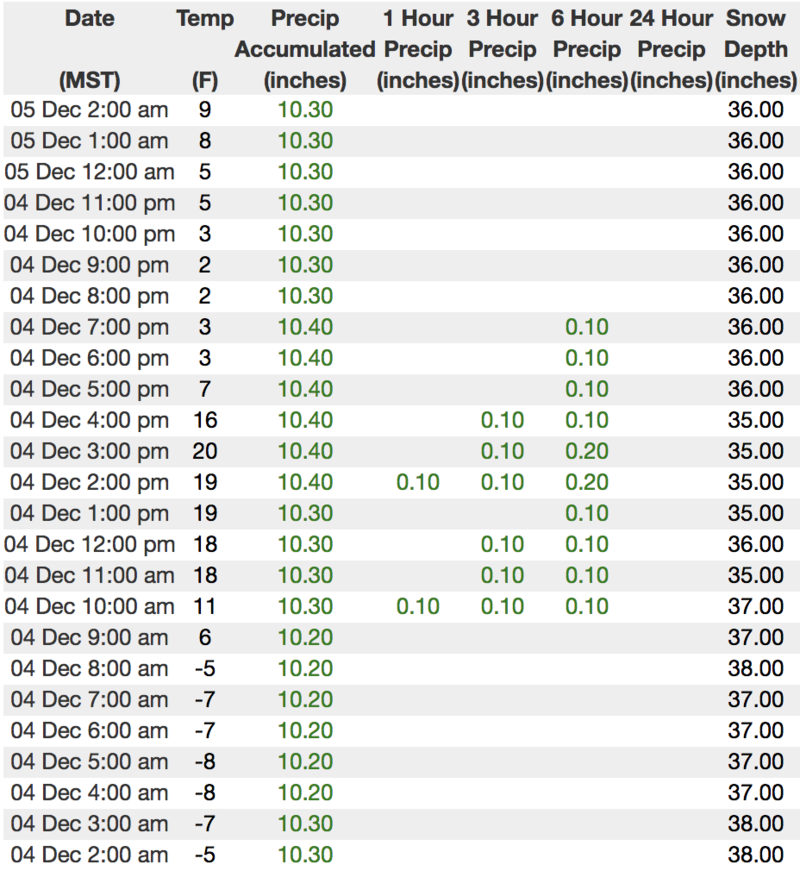 We are working to get the entire Uinta weather network back online. In the meantime, above is 24 hour data from Trail Lake (9945').