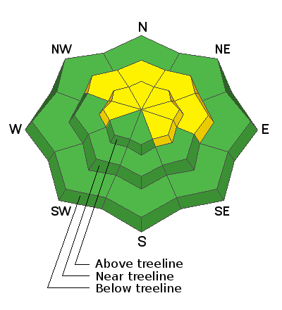 In the wind zone in mid and upper elevation terrain at and above treeline, especially on slopes facing the north half of the compass, the avalanche danger is MODERATE. While becoming harder to initiate, human triggered avalanches are POSSIBLE on any steep slope harboring old snow near the ground. Remember- triggering a slide that breaks to old snow will have severe consequences.