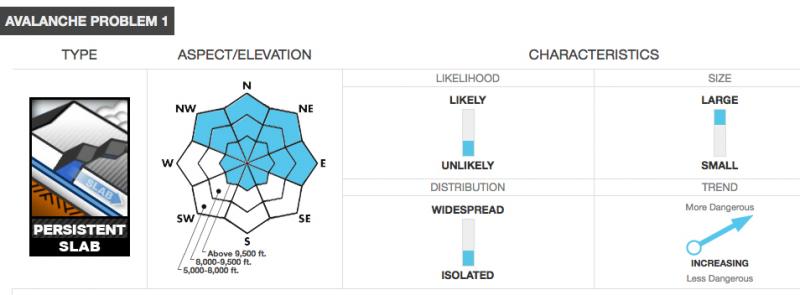 For each problem, we tell you both graphically and in text, where you will find the problem by aspect and elevation, the characteristics of the problem such as how easy it is to trigger, size, distribution the expected future trend and how to manage.