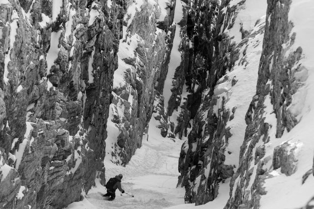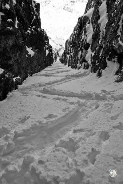 You have a little room to play with to access the couloir, but once you're in it, you're in the barrel of the gun. We noted avalanche debris in the apron and elected to travel up through the gulley of the apron. The idea being that that terrain had either already avalanched or the snowpackhad taken a direct thump from debris from above and would likely have avalanched then...not now. Still, we traveled up in two teams of two through the apron to give each other room. Once we gained the bottom opening of the couloir, we elected to continue traveling in two teams of two, skinning 90% of the way. This tells you two things: A-it never got over 40 degrees in the elevator shaft; and B-wallowingthrough the powder was waist deep...and likewise felt if we moved above any isolated areas of basal weaknesses we might stay above it on skis/skins.