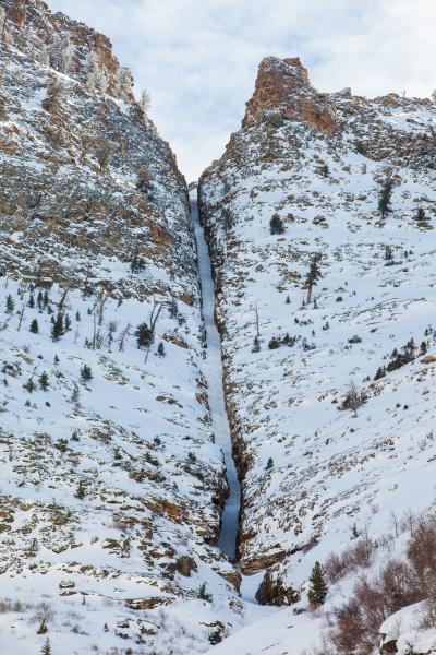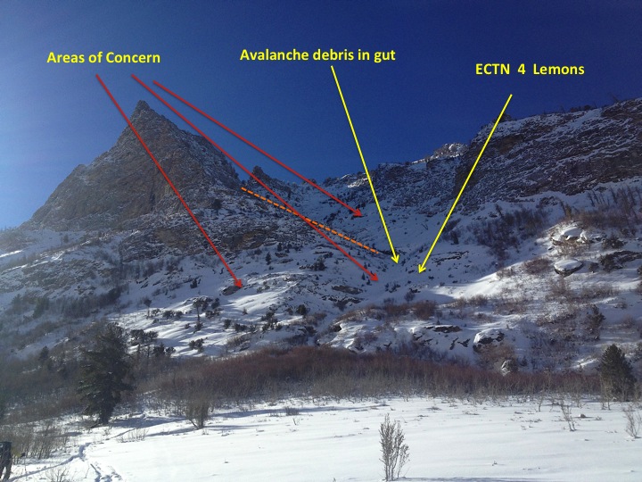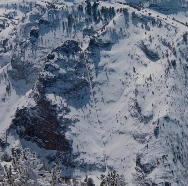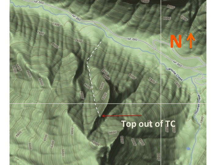 Terminal Cancer is the striking line that cleaves the north face of this ridgeline. The line is north-northwest facing, topping out at 9500'. The creek you cross to access it is at 7400'. Slope angles encountered are 30-40 degrees. Is this avalanche terrain? You bet. Our concerns were not just in the chute itself, but accessing the chute and what was adjacent to it. In other words, it is easy for the eye to be drawn to the line...and overlook the steep aprons and adjacent terrain beyond. We were just as concerned about the adjacent terrain as the chute itself.