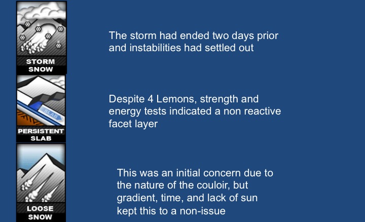 We noted no cracking or collapsing. The avalanche noted likely originated higher in the apron beneath the chute. We performed multiple probe tests to determine the structure of the snow below the chute and is outlined below. It had 4 of five lemons...the four being the top four below - Of note, the faceted layer was 4F hardness and did not seem overly weak and unconsolidated.
