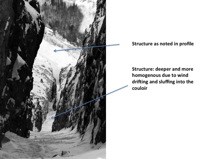 Continuous probe tests while in the barrel of the gun indicated very isolated areas of basal weaknesses...most of the structure had a very strong mid and basal structure due to wind loading and sluffing from above. Structure was good.
