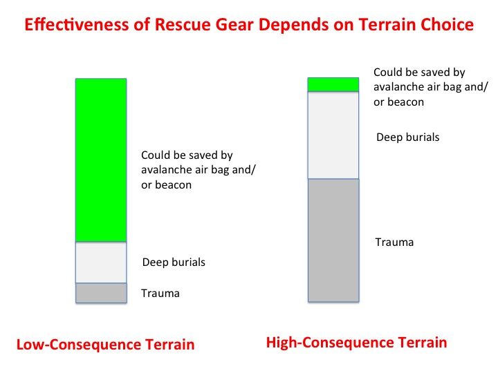 My pet peeve with this issue is that people who argue about the numbers often leave the most important part out of the discussion--terrain. If you get caught in un-survivable terrain then, guess what, you won’t survive no matter what kind of rescue gear you use. There have been a number of prominent accidents in which the victim with a deployed airbag died because he was either strained through thick trees and rocks, deposited in a terrain trap, buried deeply or went over a cliff. In zero-tolerance-for-error terrain, airbags don’t work, beacons don’t work, Avalungs don’t work. Nothing works. Save your money, buy a life insurance policy and a beacon or RECCO so rescuers don’t have to spend all night probing.