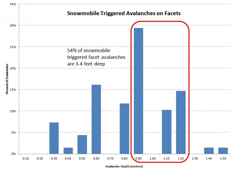 By comparison, only 15 of 217 or 7% of avalanches triggered by humans that involve facets are deeper than 3 feet. While this comparison may be skewed to some degree by terrain selection, these early season facets may continue to be an issue for snowmobilers for some time.