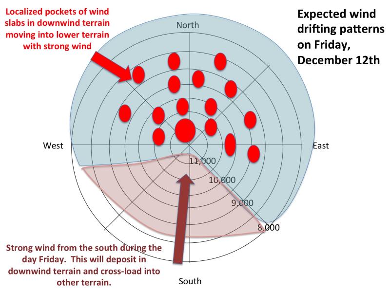 Yesterday, the wind began to blow hard from the south and very quickly began to build wind slabs, which were very sensitive because the dense slabs were deposited on top of the very weak facetedsnow and surface hoar. Wind slabs deposited on persistent weak layers like this we call persistent slabs because they act differently than normal wind slabs. They are more sensitive, last longer and more subject to remote triggers. As the wind continues to blow hard from the south today, you can expect to see patterns like this by aspect and elevation: