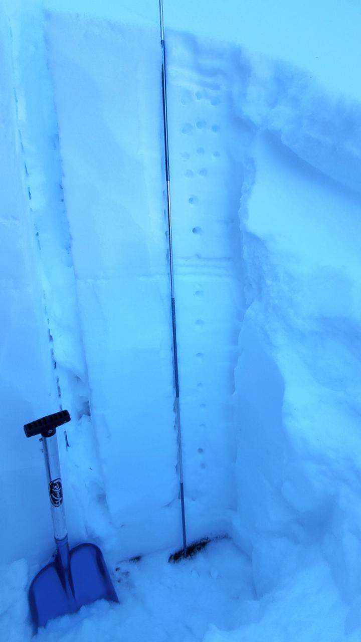 The video below shows what we found in our pit tests. We dug a pit on a north facing slope at 8700 feet. We found a total of 65 inches of snow in this location. CT tests showed a failure down about 20 inches at 15 taps and another CT test showed a failure at the ground in the faceted snow at the ground surface. Extended column tests showed a partial propagation down at 20 inches and nothing else after 30 hits.