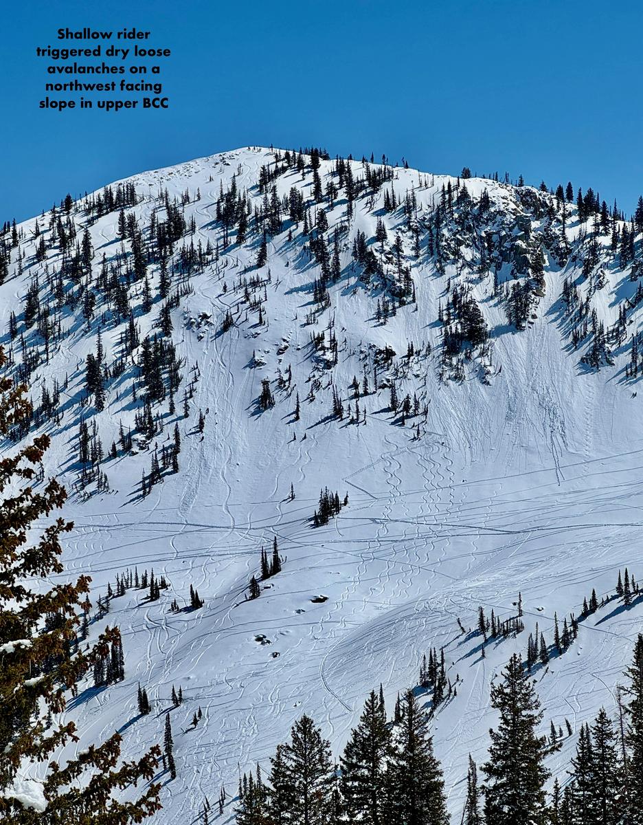 Light northwest winds on the highest ridgelines with air temperatures below in the mid 20's °F on the highest peaks and in the high 30's to mid 40's °F below 8,000'. Skies were clear and the wind kept the snow surface cool in the higher elevation terrain.