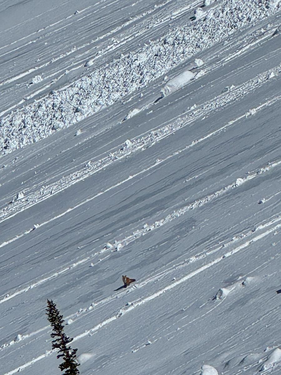 Photo of a fox giving some perspective to a wet loose debris pile on a west facing slope at 9,900'