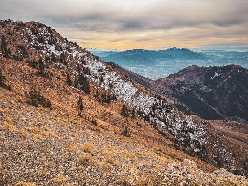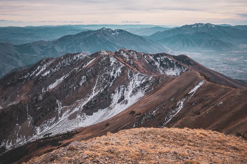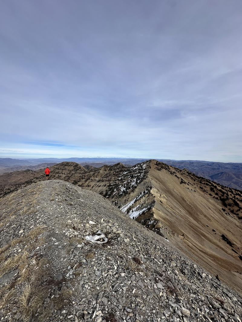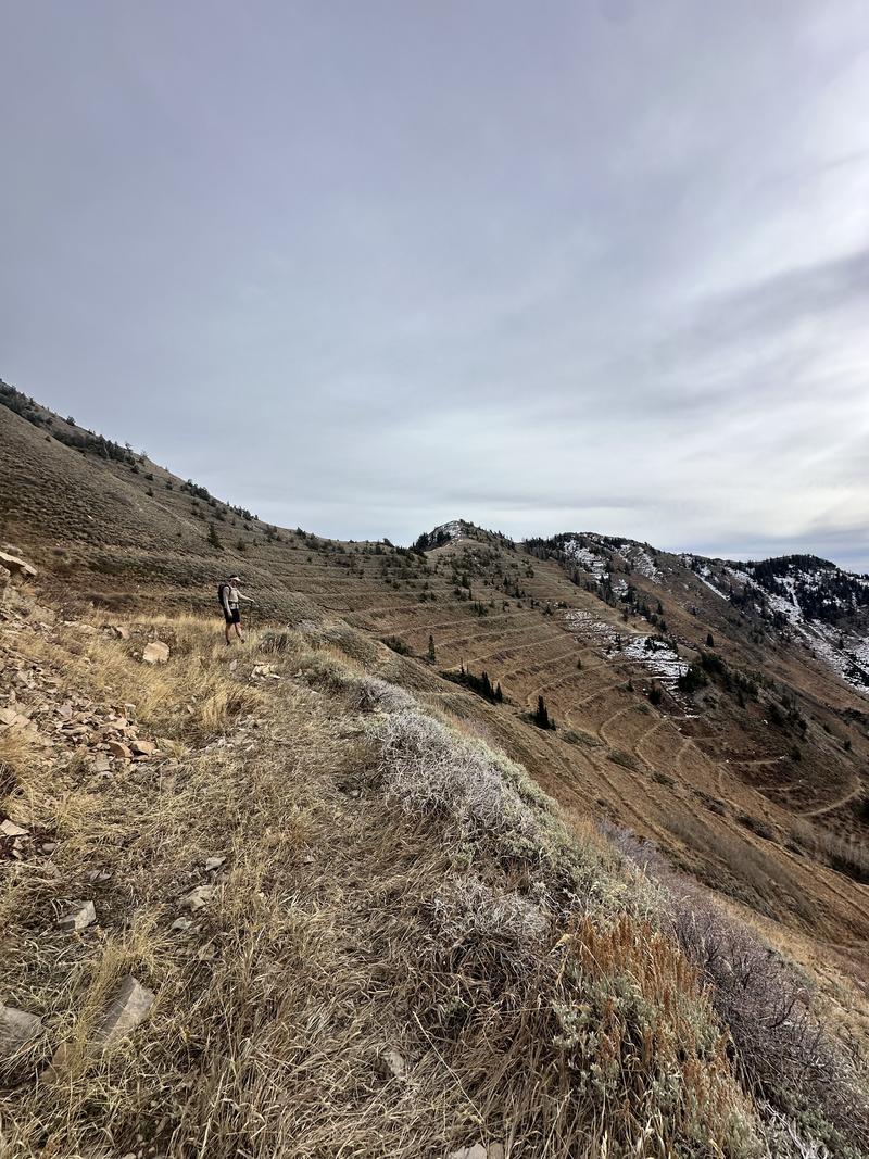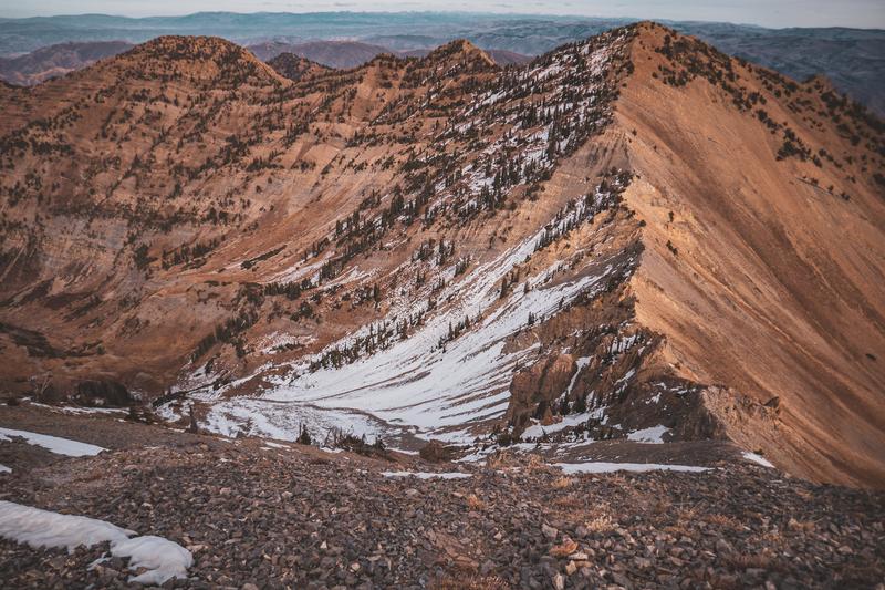 We traveled up Khyv Peak Road from Hobble Creek to climb the west side trail up Provo Peak. From there, we traveled south along the ridge and eventually down through the terraced, West-Facing slopes of Corral Mountain. We went to see the extent of existing snow coverage along the higher peaks in the Southern Wasatch. We found very few areas where old snow remained, and even fewer areas where coverage is consistent enough to pose a potential problem with future snowfall. Still, there are some isolated slopes and terrain features above ~9000' on northerly-facing slopes where I would be wary after future storms. The good news is that aside from these isolated Northerly aspects above 9000', every other slope is completely dry, with no existing snow coverage.