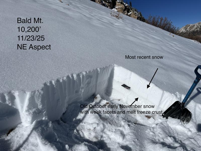 The current snow pack where it does exist is a mix of old weak early season snow with some crusts that does give it some structure and a liitle supportability. There is not much snow that is connected at this elevation around Bald Mt.