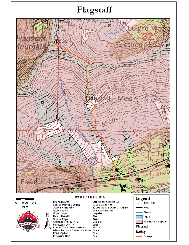 Flagstaff: Drive 7.8 miles beyond the electronic signage at the mouth of the canyon, beyond the lower Alta parking lot and park off the road just beyond the Deep Powder House and the Alta Lodge. Ascend the trail between the Our Lady of the Snows and the Alta town offices to gain the summer road beneath Flagstaff. Work up the steep slope to gain the ridgeline. Ascend to the main Cottonwood ridgeline, avoiding the avalanche terrain to the east and the west. This ridgeline is the site of many accidents and near misses over the years. One mile and 1700’ gain brings one to the sub-peak of Flagstaff. Dogs are not allowed in the watershed of LCC.